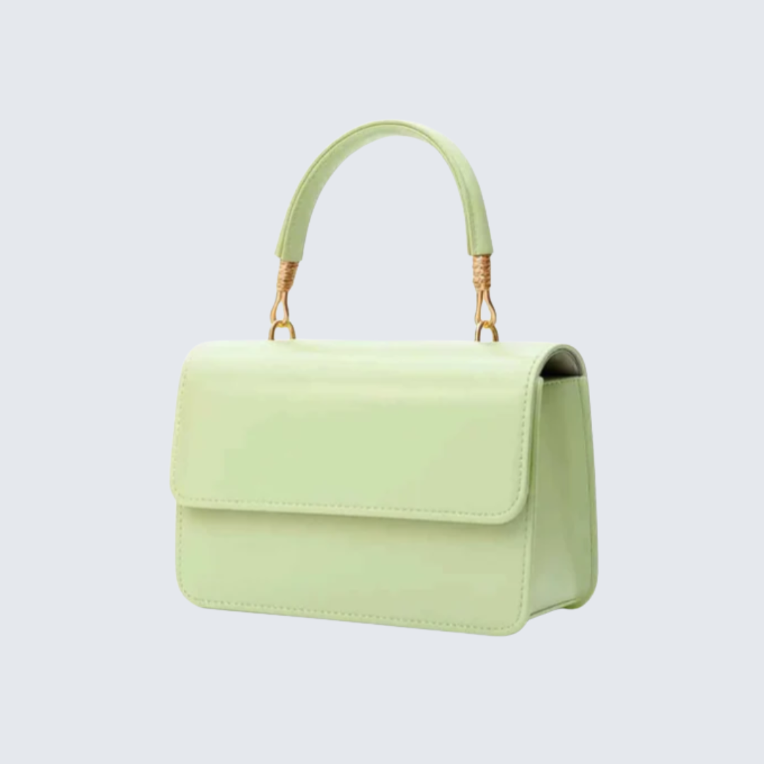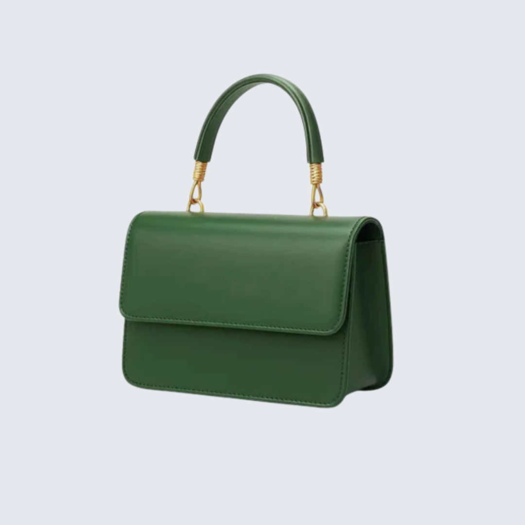 This stylish handbag is elegant and modern. It features a clean, smooth finish with a structured shape for a refined look. The gold-tone handle details add a classy touch. It is perfect for daily outings, dinners, and special occasions.