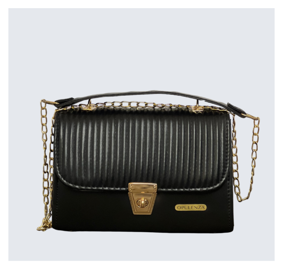 This elegant black shoulder bag is bold, sophisticated, and easy to carry. Designed with a sleek ribbed texture and finished with a gold-tone chain strap, it delivers a refined and luxurious look. The compact yet structured shape makes it perfect for carrying your daily essentials while maintaining a polished style. Ideal for evening outings, parties, and special occasions.